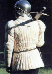 Косые лучи заходящего солнца подчеркивают сложность покроя гамбезона, вид со спины.