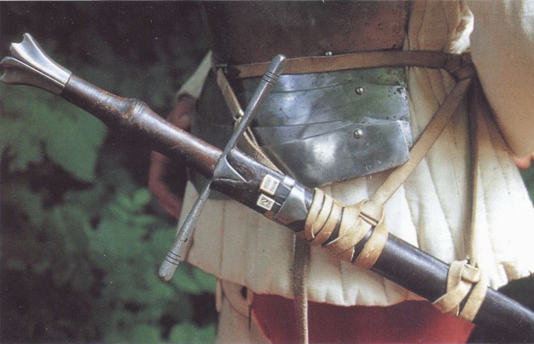 Наш солдат вооружен прекрасным полутораручным мечом, который носили подвешенным к поясному ремню или к перевязи через плечо. Обратите внимание на небольшой ножик и мусат, закрепленные на верхней стороне ножен.