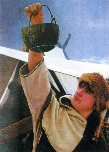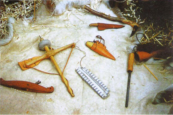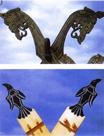 Реконструкция языческих амулетов и христианских нательных крестов. В верхнем ряду несколько образцов так называемого «молота Гора». Этот амулет изготавливался во многих вариантах, как абстрактных, так и реалистичных. Внизу справа и слева интересная промежуточная форма между молотом Тора и нательным крестом. Форма креста напоминает форму молота и носится длинным плечом вверх. Волчья морда на конце длинного плеча служила для продевания через нее цепочки. Волк был другим важным символом язычества. Внизу в центре находка из Рибе, Дания. Воин с двумя птицами па шлеме. По-видимому, этот амулет посвящен Одину, который ассоциировался с нарами животных: двумя орлами, двумя волками, восьминогой лошадью. По-видимому, неверная интерпретация подобных изображений и привела к расхожему представлению о викингах в рогатых шлемах. |