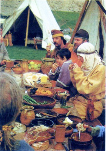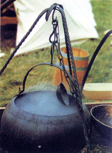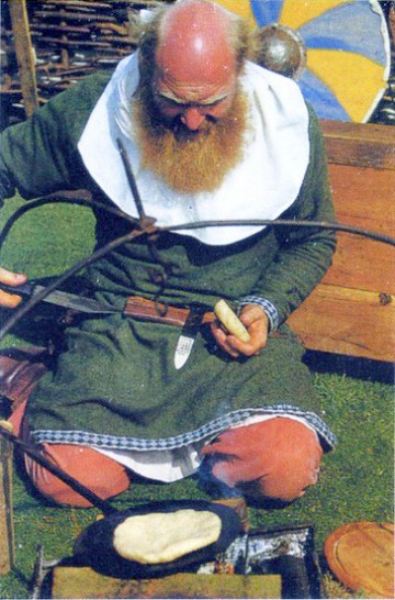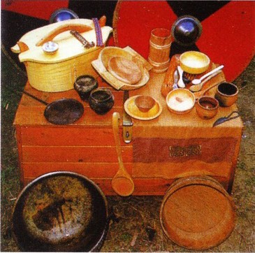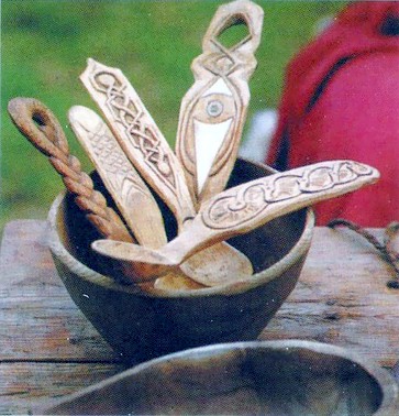 Среди домашней утвари имелись чугунные, глиняные и стеатитовые горшки, железные вертела. глиняные кувшины, деревянные и роговые ложки, деревянные и глиняные тарелки и чашки. В богатых домах имелась серебряная и стеклянная посуда. Для питья викинги обычно использовали рога. Ножи не были предметами домашней утвари. У каждого викинга имелся собственный нож, который он держал при себе все время. Ножи обнаружены как в мужских, так и в женских захоронениях. В пищу викинги употребляли мясо диких и домашних животных. рыбу, бобы и горох, зелень, орехи, ягоды и злаки. Злаки готовились в виде манной каши или лепешек.