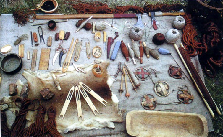 Одежда женщин не уступала по нарядности и украшениям одежде мужчин. Именно в обязанности женщин входило изготовление одежды. Все этапы технологической цепочки от прядения до окраски и ткачества проходили дома. Опытная прядильщица за десять часов работы может насучить нить для изготовления простой рубахи. То есть, пошив одежды был крайне трудоемкой работой.